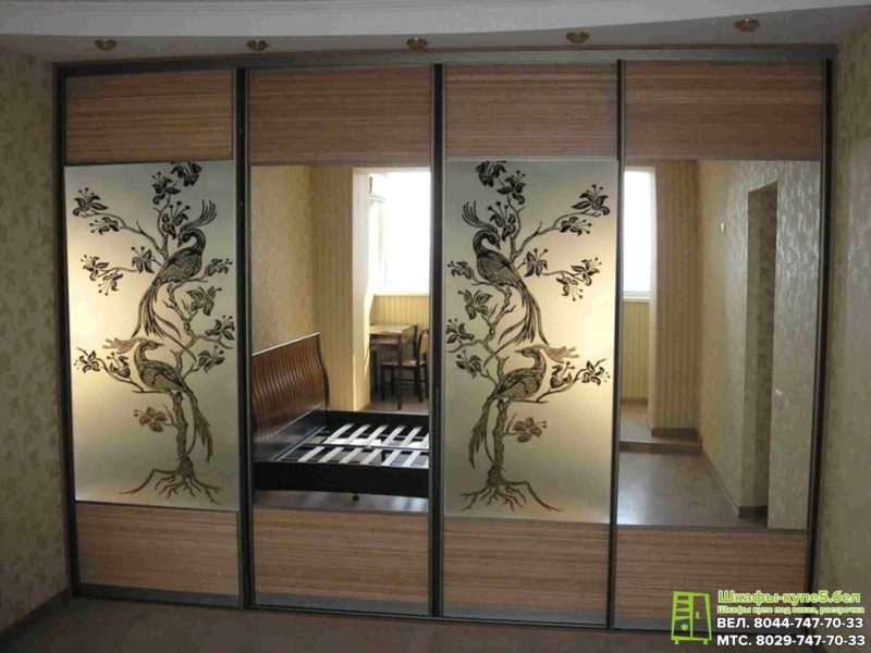Шкаф-купе пескоструй со вставками зеркала и ЛДСП